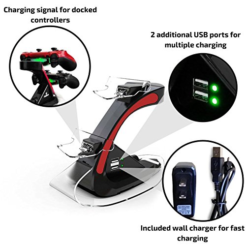TekBotic TEK Series PS4 Controller Dock- Multi PS4 Dock with Dual LED Indicator Lights + Two Additional USB Ports on the PS4 Controller Stand (Red)